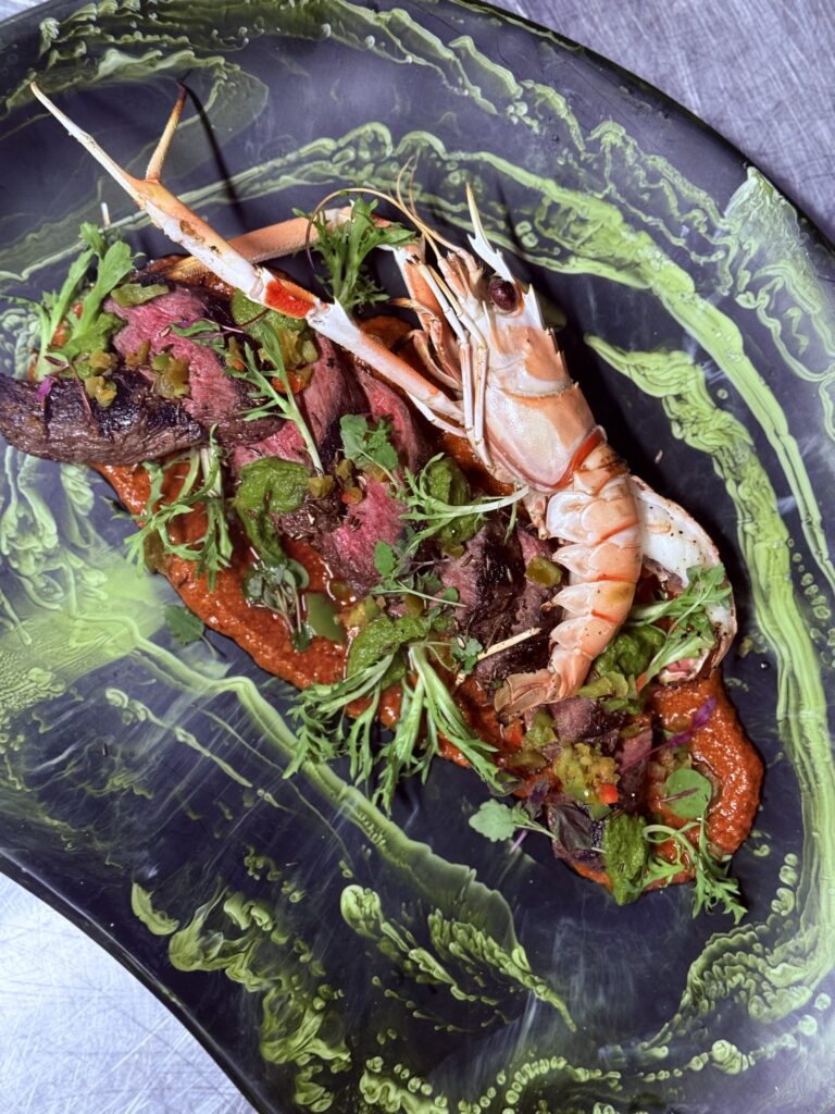 6 – Plate – muhammara on the base, sliced kangaroo loin, grilled yabby, green sauce drizzle, frisee, popped millet, baby herbs and diced escabeche
